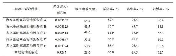 mN/m,潤濕角改變值≥40°,減阻率≥70%,防膨率≥90%,阻垢率≥80%。從表2中數(shù)據(jù)可以看出,新研究的海水基耐高溫驅(qū)油壓裂液,在實驗溫度180℃條件下,各項指標(biāo)均達(dá)到海上油田的要求;在相同條件下,其界面張力值、潤濕角改變值、減阻率、防膨率、阻垢率均優(yōu)于常規(guī)驅(qū)油壓裂液產(chǎn)品。