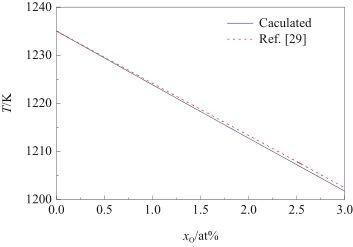 為了驗證這種近似處理的合理性,使用理想溶體近似模型計算Ag-O系的液相線,并將結(jié)果與實驗相圖進行比較。
