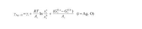 式中,γAg-O表示Ag-O系的表面張力(N/m),γi表示純組分i的表面張力(N/m),R為氣體常數(shù)[J/(mol·K)],x和x分別表示組分i在表面相和本體相中的摩爾分數(shù)(mol/mol),Ai為組分i的摩爾表面積(m2/mol),G和G分別表示表面相和本體相中組分i的偏摩爾過剩自由能(J/mol),并且G=λG,其中λ為表面相和本體相的原子配位數(shù)之比[27]。G可由摩爾過剩自由能GE,b表示,其關(guān)系式為:
