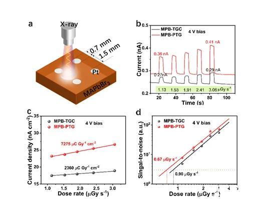 圖4.MAPbBr3單晶探測(cè)器的x射線(xiàn)探測(cè)器。(a)結(jié)構(gòu)圖;(b)光電流響應(yīng);(c)靈敏度;(d)探測(cè)極限。
