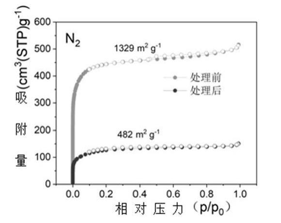 步驟1所用活性碳纖維以及本實(shí)施例制備得到的高能量轉(zhuǎn)化效率的碳材料的氮?dú)馕摳綔y試可以看出:制備前活性碳纖維的氮?dú)馕摳綔y出比表面積為1329m2/g,經(jīng)過處理,比表面積降至482m2/g,說明蒽在孔內(nèi)的沉積改變了孔的結(jié)構(gòu),減小了孔容,孔腹尺寸被收縮;