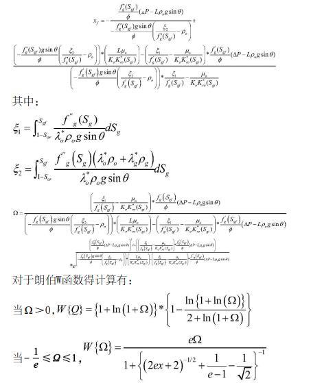 將速度場方程與氣體分流率方程結(jié)合,在遵循氣體質(zhì)量守恒的基礎(chǔ)上,從CO2入口端到混相帶前緣對含氣飽和度進(jìn)行積分,并用朗伯W函數(shù)求解得出混相前緣的位置,其表達(dá)式如下: