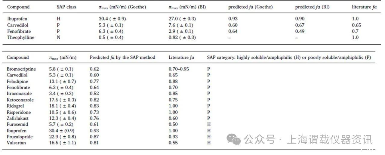 在LCs(先導(dǎo)藥物)的早期研究中,只有少量的化合物可用,如果化合物是兩親性的,SAP方法似乎是獲得fa的一個(gè)有效且快速的工具。只需要少量的LC原液的解決方案(50μl)通過(guò)Delta-8儀器進(jìn)行分析,而沒有采用進(jìn)一步分析如高效液相色譜法分析,高效液相色譜法盡管其簡(jiǎn)單,能夠預(yù)測(cè)廣泛化合物的藥物的生物利用度(fa),包括高溶性和低溶性的兩親性化合物。而對(duì)于難溶性和高溶性兩親性化合物,改進(jìn)的SAP(表面活性譜法)預(yù)測(cè)fa值與文獻(xiàn)報(bào)道的藥物分子的fa值相近。但是此方法不適合預(yù)測(cè)非兩親性藥物的fa值。