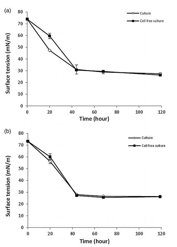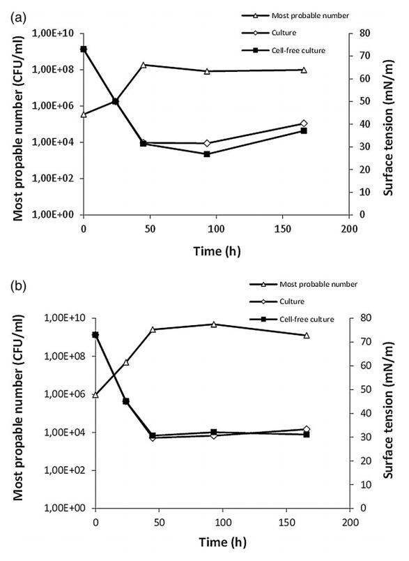 菌株紅球菌屬。 菌株 LF-13 和紅球菌屬。 大約 2 天后,菌株 LF-22 達(dá)到穩(wěn)定期(圖 1)。 LF-13 和 LF-22 的培養(yǎng)物表面張力的最低值分別為 31.8 和 29.3 mN m-1,當(dāng)培養(yǎng)物達(dá)到穩(wěn)定期時(shí)(圖 1)。 無(wú)細(xì)胞制劑的值顯示出與培養(yǎng)物類(lèi)似的降低,表明生物表面活性劑被釋放到培養(yǎng)基中。 從工業(yè)角度來(lái)看,將生物表面活性劑分泌到培養(yǎng)基中的分離物很有趣,因?yàn)檫@使得生物表面活性劑的純化過(guò)程更簡(jiǎn)單。 [16,44,45]