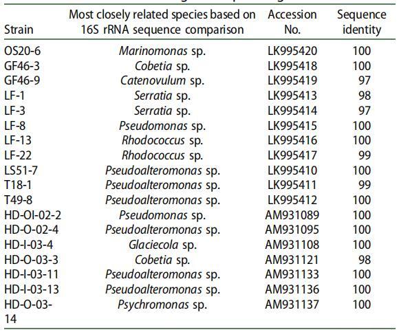 通過(guò) 16S rRNA 基因序列分析對(duì)具有顯著 SAC 活性的 18 個(gè)分離株進(jìn)行分類(lèi)鑒定(表 2)。 紅球菌除外。 菌株 LF-13 和紅球菌屬。 在菌株 LF-22 中,大多數(shù)鑒定的 SAC 生產(chǎn)者是革蘭氏陰性菌,屬于 γ-變形菌綱。 也有報(bào)道稱(chēng) γ-變形菌在寒冷海洋地區(qū)的石油污染地點(diǎn)占優(yōu)勢(shì)。 [21-24] 先前對(duì)石油污染地點(diǎn)的研究表明,假單胞菌、假交替單胞菌、冰川、海藻和紅球菌是極地、海洋區(qū)域。[21,22,25-28]