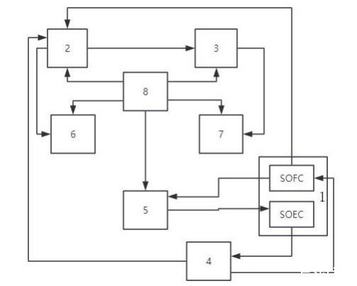 所述供電模塊1包括SOFC-SOEC電池1-1、工業(yè)用電單元1-2、逆變器1-3、高頻感應(yīng)電源1-4,所述工業(yè)用電單元1-2分別與所述SOFC-SOEC電池1-1中的SOEC電解池、所述等離子噴射模塊2連接,所述儲(chǔ)氫模塊4分別與所述SOEC電解池、SOFC燃料電池、等離子噴射模塊2連接,將SOEC電解池電解氫收集存儲(chǔ)的氫氣用于SOFC燃料電池使用、為等離子噴射模塊2中等離子噴射器供應(yīng)電離氣體(氫氣);所述SOFC燃料電池、SOEC電解池均與所述蓄熱模塊5連接。