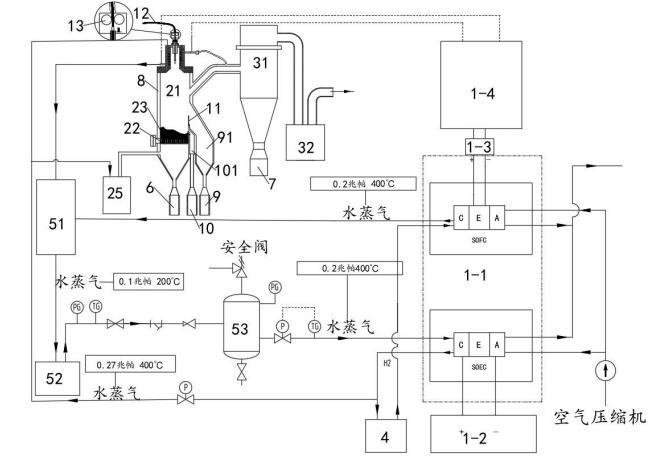 所述供電模塊1中的SOFC燃料電池產(chǎn)生的水蒸氣(0.2Mpa,400℃)進(jìn)入所述汽水混合加熱器51中,所述等離子噴射模塊2、分離過(guò)濾模塊3、粗粉收集罐6、細(xì)粉收集罐7與冷卻模塊8換熱后的水(當(dāng)冷卻介質(zhì)為水時(shí))也進(jìn)入所述汽水混合加熱器51中,通過(guò)所述汽水混合加熱器51的作用將其轉(zhuǎn)化為水蒸氣并傳輸?shù)剿稣羝l(fā)生器52中,所述蒸汽發(fā)生器52將水蒸氣以(0.2Mpa,400℃)的狀態(tài)傳輸?shù)椒€(wěn)壓罐53中,通過(guò)穩(wěn)壓罐53穩(wěn)壓并去除水蒸氣中夾雜的水滴后,高溫的水蒸氣進(jìn)入SOEC電解池中參與電解制氫,并通過(guò)儲(chǔ)氫模塊4將制備的氫氣存儲(chǔ)備用。該過(guò)程將分離提純過(guò)程中供電模塊1中燃料電池燃燒放電產(chǎn)生的高溫水蒸氣與冷卻換熱的熱量加以回收利用,為SOEC電解池提供熱量,避免或減少外部能量的輸入,降低成本。
