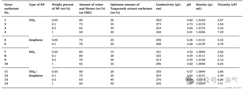 本研究研究了石墨烯、二氧化鈦(TiO2)和二氧化硅(SiO2)納米顆粒、TiO2和石墨烯的復(fù)合納米粒子以及指甲花提取物表面活性劑的納米復(fù)合物對降低油水界面張力的影響。研究人員使用溶膠-凝膠技術(shù)合成上述納米顆粒,并采用天然水性懸浮表面活性劑(黃芪膠提取物)對納米表面活性劑的穩(wěn)定性進行了研究。通過電導(dǎo)率、濁度和界面張力實驗測定了指甲花提取物表面活性劑的CMC值。為了穩(wěn)定重量百分比不同且納米顆粒類型也不同的納米表面活性劑,使用粒徑和zeta電位測量來確定黃芪膠表面活性劑各自的最佳濃度。最后,通過界面張力測量,使用穩(wěn)定的納米表面活性劑來研究其對IFT的影響。