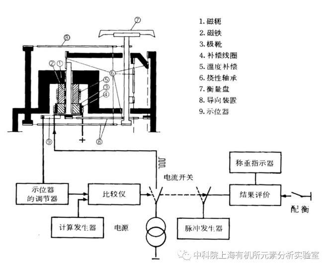 電子天平的結(jié)構(gòu)原理如上圖所示。包括衡量盤在內(nèi)的載荷接收裝置由兩對三角形導(dǎo)向裝置控制,衡量盤只能進行垂直運動。磁鐵裝置由永久磁鐵組成,磁軛和極靴連接在載荷接收裝置的最下端,補償線圈放在磁鐵裝置的空氣間隙中。如果電流流往線圈,線圈中就產(chǎn)生直接向上的力,這種力作用于衡量盤上的重力。光電掃描裝置使這種力能辨別載荷接收裝置預(yù)先規(guī)定的中心位置。如果載荷有變位,調(diào)節(jié)器及其放大器就改變流經(jīng)線圈的電流,直到回到中心位置為止。在小載荷的情況下,電流通過時間短,載荷大時電流停留的時間長。通電流的時間間隔是通過平衡位置掃描的可變增益放大器來調(diào)節(jié)的,而且這種時間間隔直接與載荷成正比。這樣,當用加載的方式接通電流時,就用計算器計算脈沖。當測量結(jié)束時,計算器指示其結(jié)果。概況來說,電磁力平衡式電子分析天平是把待測物的質(zhì)量通過電磁力平衡原理變換為電流檢測,再經(jīng)電流/電壓變換、模/數(shù)轉(zhuǎn)換和數(shù)字化運算處理,用數(shù)字顯示待測物的質(zhì)量值。