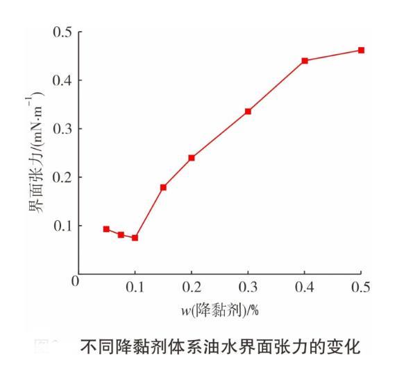 圖1為在不同降黏劑質(zhì)量分數(shù)下,體系油水界面張力的變化情況。從圖1可知,在降黏劑質(zhì)量分數(shù)為0.05%~0.10%時,界面張力隨質(zhì)量分數(shù)增加而降低。當降黏劑質(zhì)量分數(shù)超過0.10%時,界面張力開始上升。在低質(zhì)量分數(shù)下,降黏劑在油水界面上形成吸附膜,降低界面張力。當降黏劑質(zhì)量分數(shù)超過臨界膠束含量后,降黏劑在界面聚集數(shù)量增加,吸附層排布更不規(guī)則,導(dǎo)致界面張力升高。