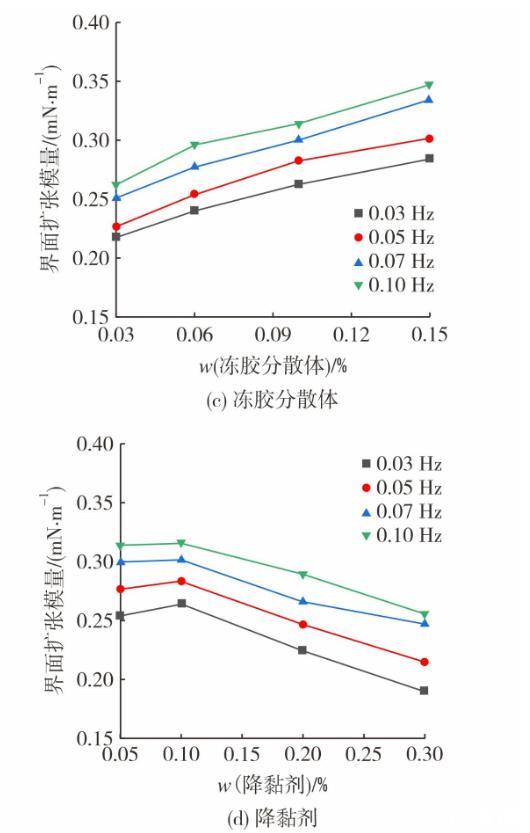 圖2(b)和圖2(d)為降黏劑質(zhì)量分數(shù)對界面流變性質(zhì)的影響,凍膠分散體質(zhì)量分數(shù)固定為0.06%。在降黏劑質(zhì)量分數(shù)為0.05%~0.10%的范圍內(nèi),隨著降黏劑質(zhì)量分數(shù)的增加,動態(tài)界面張力穩(wěn)定值下降。但當質(zhì)量分數(shù)超過0.10%時,隨著質(zhì)量分數(shù)的增加,動態(tài)界面張力穩(wěn)定值增大。體系的擴張模量變化趨勢與動態(tài)界面張力相同。在低質(zhì)量分數(shù)情況下,隨著降黏劑分子數(shù)量的增多,逐漸在油水界面形成有序的吸附層,使得界面膜的強度不斷增大,動態(tài)界面張力降低,界面擴張模量增大。而在高質(zhì)量分數(shù)下,降黏劑在界面層吸附飽和后,質(zhì)量分數(shù)繼續(xù)增加會增強空間位阻效應(yīng),使降黏劑的部分親水基團從水相中逸出,形成膠束聚集體,對吸附膜的強度產(chǎn)生負面影響,使得界面擴張模量減低。因此,當降黏劑質(zhì)量分數(shù)為0.10%時,體系在稠油界面層形成的界面膜最為穩(wěn)定,體系的乳化降黏能力最強。