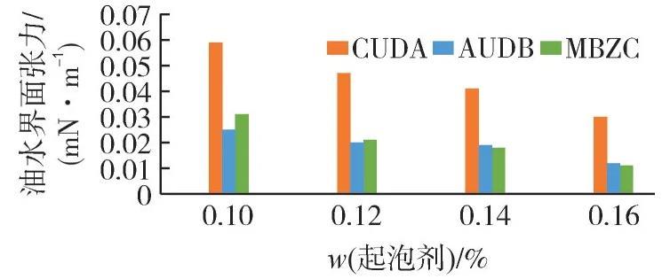 由圖3可知:隨著起泡劑用量的增加,3種起泡劑的油水界面張力逐漸降低,且在質(zhì)量分?jǐn)?shù)達(dá)到0.16%時(shí),油水界面張力降低到最低值,其中AUDB與MBZC型起泡劑的油水界面張力均低于0.02 mN/m,達(dá)到低界面張力驅(qū)油的要求。