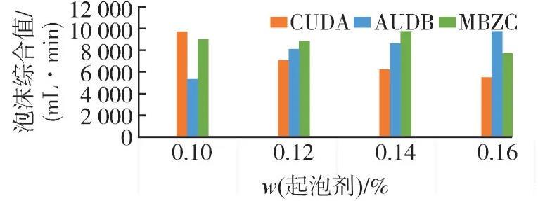 泡沫性能直接關(guān)系到起泡劑在地層的封堵效果。目前,油田驅(qū)油用表面活性劑工業(yè)品主要有陰離子型、非離子型和兩性型單獨(dú)或復(fù)配使用,其泡沫性能差別很大。起泡劑的濃度是影響起泡劑活性的重要因素之一,合理的濃度設(shè)置必須使其既具有高效的泡沫特性也具有一定的經(jīng)濟(jì)性,故選擇CUDA、AUDB、MBZC這3種非離子-陰離子型起泡劑,在其質(zhì)量分?jǐn)?shù)分別為0.10%、0.12%、0.14%和0.16%時(shí),評(píng)價(jià)這3種起泡劑發(fā)泡量、半衰期、泡沫綜合指數(shù)等性能。