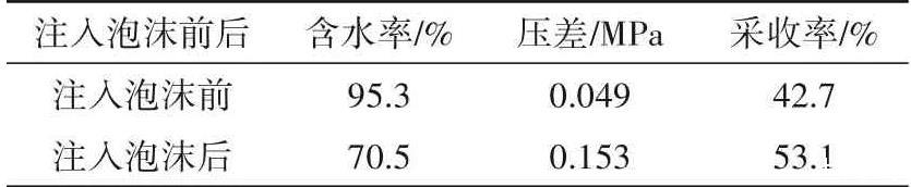 由表1可知:在注入泡沫前,采出液的含水率達(dá)到95.3%,在向膠結(jié)巖心中注入0.3 PV的泡沫流體后含水率顯著下降到70.5%,注入泡沫流體前后壓差達(dá)0.104 MPa,說(shuō)明AUDB型起泡劑混合氮?dú)庑纬傻呐菽哂辛己玫姆舛滦ЧW⑷肱菽黧w后,采收率明顯提高,由42.7%提高至53.1%,說(shuō)明AUDB型起泡劑具有良好的洗油效果。