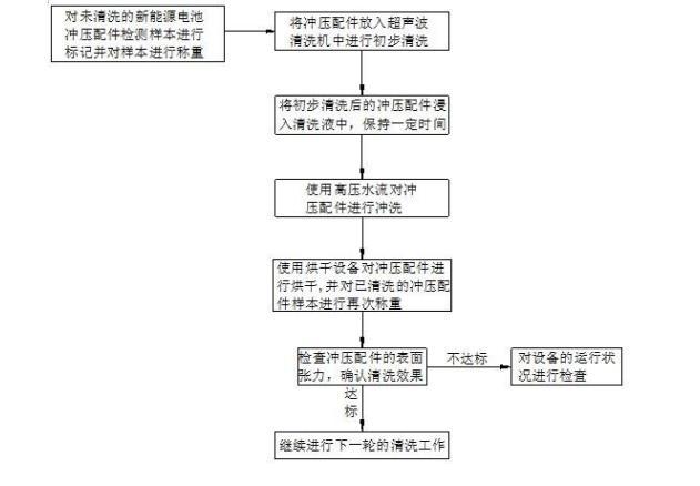 此沖壓配件的表面張力改善方法,就是通過(guò)將同一生產(chǎn)批次的沖壓配件放入超聲波清洗機(jī)中,超聲波清洗機(jī)產(chǎn)生的超聲波的高頻振動(dòng)能夠產(chǎn)生微小的氣泡,這些氣泡在液體中爆裂時(shí)會(huì)產(chǎn)生沖擊力,對(duì)沖壓配件進(jìn)行初步清洗。然后,將經(jīng)過(guò)初步清洗的沖壓配件放入事先配置好的碳?xì)淝逑匆褐校M(jìn)一步去除沖壓配件表面的氧化物和殘留物。再將經(jīng)過(guò)清洗液清潔處理過(guò)的沖壓配件取出,并使用高壓水流對(duì)清潔后的沖壓配件進(jìn)行沖洗,去除表面上的頑固污漬和顆粒,確保沖壓配件上的清洗液和殘留物被徹底清除。通過(guò)多重的清洗流程,有效提升新能源電池沖壓配件表面的清潔度,能夠達(dá)到理想的清洗效果,有效改善新能源電池沖壓配件的表面張力。