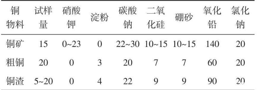 配料前可根據(jù)待測(cè)物組分確定熔渣的硅酸度,然后計(jì)算各熔劑的需要量。同時(shí)根據(jù)試樣還原力試驗(yàn)結(jié)果(或理論計(jì)算試樣的還原力)調(diào)整氧化劑或還原劑加入量。通過(guò)優(yōu)選實(shí)驗(yàn),推薦含銅物料的配料可按表1進(jìn)行。
