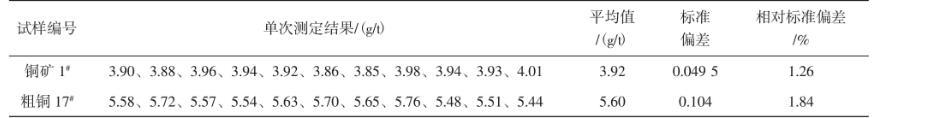 稱取20.00 g樣品,銅礦、銅渣樣直接干法試金配料,按試驗(yàn)方法進(jìn)行分析,結(jié)果見(jiàn)表4和表5。