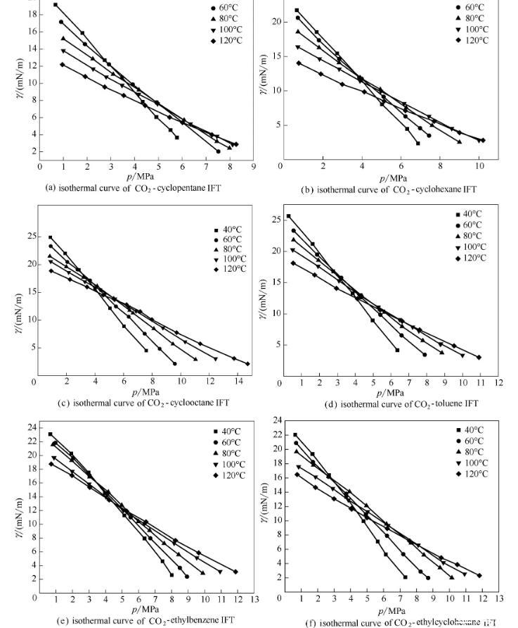 本文采用懸滴法測(cè)定了CO2-環(huán)戊烷/環(huán)己烷/環(huán)辛烷/甲苯/乙苯/乙基環(huán)己烷的界面張力,測(cè)量范圍為40~120℃,0.27~14.70 MPa。探討了壓力、溫度、碳原子數(shù)以及分子結(jié)構(gòu)對(duì)界面張力的影響并提出了計(jì)算CO2-原油組分界面張力的經(jīng)驗(yàn)方程。得出以下結(jié)論。