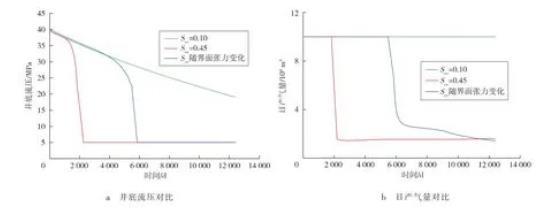 設(shè)計機理模型和數(shù)值模擬方案,建立組分模型分析變凝析油氣臨界流動飽和度對開發(fā)指標預(yù)測的影響,模型網(wǎng)格為50×50×7,滲透率為10×10-3μm2,孔隙度為15%,地質(zhì)儲量為10×108m3。設(shè)計日產(chǎn)氣量為10×104m3,最小井底流壓為5 MPa,以及Scc=0.10、Scc隨界面張力變化及Scc=0.45時,預(yù)測凝析油臨界流動飽和度及不同方案的生產(chǎn)特征。