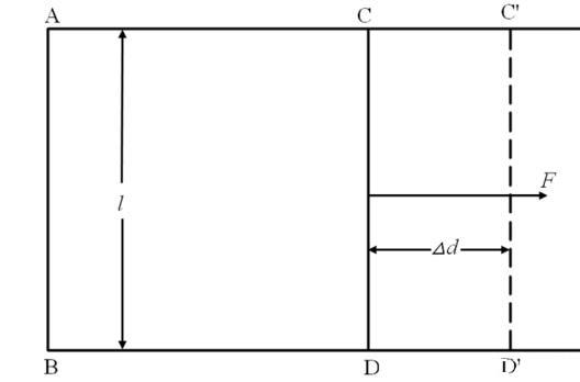 研究液體表面張力隨液體濃度、溫度、壓強等的變化規(guī)律的論著很多,卻很少有人研究液體表面張力隨液面拉伸程度的變化規(guī)律,從而隱喻了一種結論,即液體在濃度、溫度、壓強等條件不變時,其表面張力的大小不會隨其表面被拉伸的程度而改變。多部專著都有這樣的經典的論述,圖1所示的矩形金屬絲框覆有液膜,其中CD為活動邊,長為l,欲使體系平衡,必須施以適當的力F于CD邊上。CD邊在力F作用下克服液膜表面張力的阻礙而移動距離Δd,對體系做功ΔA=F×Δd,F(xiàn)=2γ×l,γ=F/2l為CD邊的液體表面張力系數。在此論述中,先驗地將液體表面張力視為不隨液膜面積變化而改變的恒量。