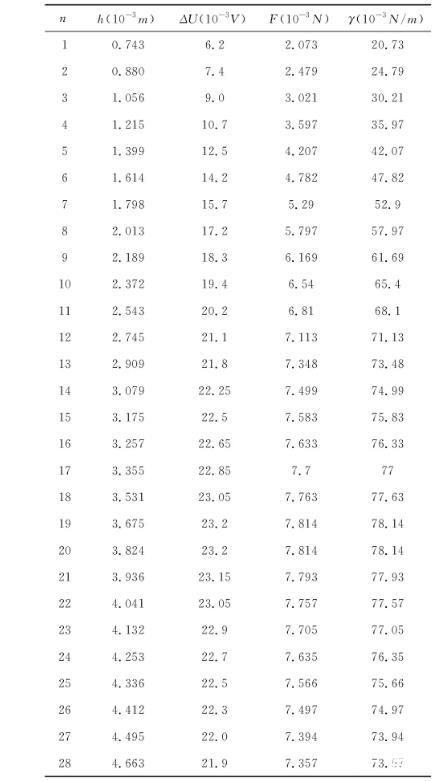 將拉力框置于待測液體中,調節(jié)好刀口與液面的平行度。讓液面緩慢上升至與刀口接觸。然后下降液面,形成并拉伸液膜至液膜斷裂。記錄此過程中液面在不同高度(即液膜不同拉伸長度)時的位置及此時力敏傳感器的讀數U,根據f=kU,(力敏傳感器的轉換系數k=340.2×10-6N/mV),可計算出不同高度的受力大小fn。