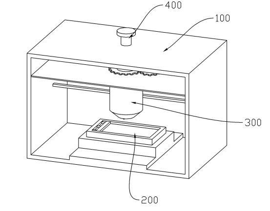 本實施例通過設置外殼100、涂片臺200和滴液機構300配合,在進行滴液操作時,使滴液筒310繞第一方向轉動,當滴液筒310轉動時,將促使副筒320和外筒330沿第一方向移動,且此時副筒320移動使滴液腔340體積變小,外筒330移動使第一空腔350體積變大。而滴液腔340體積變小將使滴液腔340內的待檢測液從出液口311擠出,由于滴液筒310繞第一方向轉動,因此從滴液腔340內推出的待檢測液也將轉動,進而使得當待檢測液沿第一方向靠近涂片臺200的一端與涂片臺200接觸時,隨著滴液筒310的持續(xù)轉動,將在滴液筒310與待檢測液連接的一端形成一個扭轉力,進而促使待檢測液滴落,避免液滴因其表面張力的作用不容易斷開,且在進行滴液操作時,第一空腔350體積變大后,第一空腔350內部將產生負壓,進而使外界氣體能夠從進氣口331進入第一空腔350內,而當氣體從進氣口331經過時,隨著滴液筒310的轉動,氣流將在出液口311的周向方向上產生一個擠壓力,進一步促使液滴與出液口311脫離。