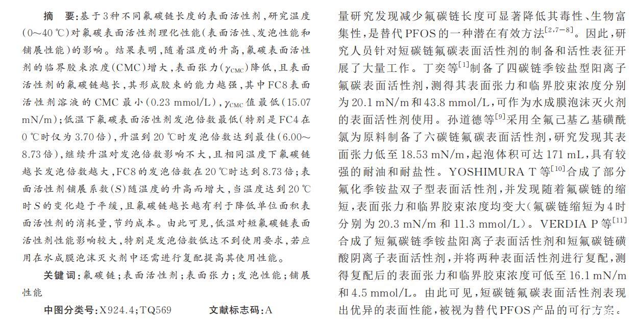 結果表明,隨著溫度的升高,氟碳表面活性劑的臨界膠束濃度(CMC)增大,表面張力(γCMC)降低,且表面活性劑的氟碳鏈越長,其形成膠束的能力越強,其中FC8表面活性劑溶液的CMC最?。?.23 mmol/L),γCMC值最低(15.07mN/m);低溫下氟碳表面活性劑發(fā)泡倍數(shù)最低(特別是FC4在0℃時僅為3.70倍),升溫到20℃時發(fā)泡倍數(shù)達到最佳(6.00——8.73倍),繼續(xù)升溫對發(fā)泡倍數(shù)影響不大,且相同溫度下氟碳鏈越長發(fā)泡倍數(shù)越大,F(xiàn)C8的發(fā)泡倍數(shù)在20℃時達到8.73倍;表面活性劑鋪展系數(shù)(S)隨溫度的升高而增大,當溫度達到20℃時S的變化趨于平緩,且氟碳鏈越長越有利于降低單位面積表面活性劑的消耗量,節(jié)約成本。