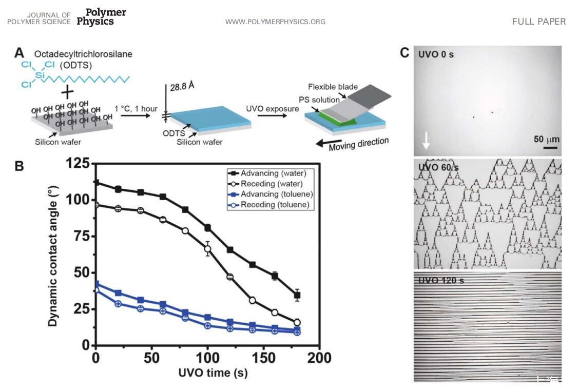圖 1 (A) 制備具有可調(diào)表面能的基材然后應用流涂工藝的示意圖。 (B) 動態(tài) 接觸角包括作為 UVO 時間函數(shù)的基材的前進(實心數(shù)據(jù)點)和后退(開放數(shù)據(jù)點)。 使用水(黑色數(shù)據(jù)點)和甲苯(藍色數(shù)據(jù)點)的液體。 誤差棒表示三個的標準偏差 獨立樣本。 (C) 在具有可調(diào)表面能的基材上制造的結構,從無沉積、超支化結構到通過流涂的水平線。 此處使用的其他流涂參數(shù)是初始濃度 co,如 0.5 mg/mL,停止時間 t 為 100 ms,設置距離 d 為 5 lm。