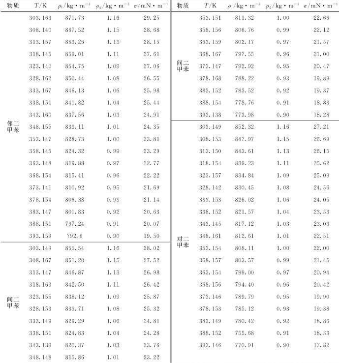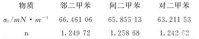 表4鄰二甲苯、間二甲苯和對(duì)二甲苯表面張力擬合參數(shù)