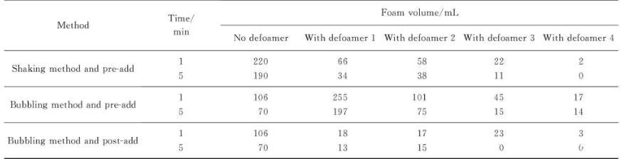(3)消泡性能測試方法中,搖瓶法偏重研究消泡劑的消泡性能,鼓氣法偏重于研究消泡劑的抑泡性能。添加方式中后添加比先添加表現(xiàn)出更好的消抑泡性能。