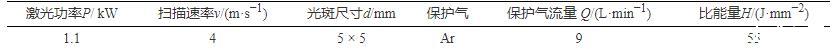 激光釬涂是利用激光作為熱源使釬料層熔化,進(jìn)而潤濕并連接金剛石與基材的工藝,其原理如圖2所示。與傳統(tǒng)真空釬涂工藝相比,激光釬涂工藝可顯著降低涂層能量輸入,大大縮短熱循環(huán)周期,具有非常好的結(jié)構(gòu)和工藝適應(yīng)性。文中激光釬涂試驗(yàn)系統(tǒng)包括功率為6 kW的LYS-6000-ST2型光纖激光設(shè)備和AcutEye型庫卡軌道機(jī)器人。分別對釬料涂層和釬料/金剛石涂層進(jìn)行激光釬涂試驗(yàn)。金剛石釬涂試驗(yàn)時(shí),首先將BNi-2釬料鋪在65Mn基板上,粉末厚度為0.5 mm,然后在BNi-2釬料層上沉積金剛石顆粒,隨后在金剛石表面再預(yù)置一層0.5mm的粉末釬料。首先,預(yù)置1 mm厚度的釬料合金粉末層,然后進(jìn)行釬涂試驗(yàn),工藝參數(shù)如表1所示。試驗(yàn)過程中,利用激光釬涂系統(tǒng)配備的高速攝像機(jī)觀察釬料層的熔化過程。使用Zeiss Smartzoom5型超景深顯微鏡對涂層形貌進(jìn)行三維觀察和尺寸測量。通過Image-pro plus 6.0軟件對涂層超景深圖片色域進(jìn)行調(diào)整,直至色域所覆蓋的區(qū)域?yàn)榭紫端紖^(qū)域,測量方式選擇Per area(單位面積)。