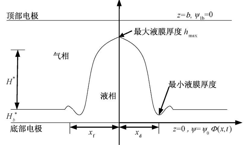 上述研究表明,電場強(qiáng)度對(duì)表面張力的影響大致分為表面張力隨電場強(qiáng)度提高而減小、增大和不變等三種情形。而目前對(duì)于受電場作用時(shí)的液滴運(yùn)動(dòng)的理論研究中,均假設(shè)表面張力不受電場影響,即表面張力不變,進(jìn)而模擬其運(yùn)動(dòng)特征;這顯然與上述多數(shù)實(shí)驗(yàn)所得結(jié)論明顯不符,也不能準(zhǔn)確反映電場對(duì)液滴運(yùn)動(dòng)的影響。為此,本文基于實(shí)驗(yàn)研究結(jié)果,建立表面張力與電場強(qiáng)度間的關(guān)系式,推導(dǎo)電場作用下描述液滴運(yùn)動(dòng)過程的演化方程,采用數(shù)值模擬獲得不同電場情形下的液滴運(yùn)動(dòng)行為,進(jìn)而分析因電場作用帶來的表面張力變化對(duì)液滴運(yùn)動(dòng)特征的影響。
