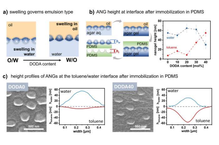 圖1展示了制備兩親性納米凝膠(ANG)的合成方案,以及不同ANG的性質(zhì)。通過(guò)在反應(yīng)性前體顆粒上功能化混合親水(HPA)和親油(DODA)胺,制備了具有不同網(wǎng)絡(luò)疏水性的ANG(圖1a)。動(dòng)態(tài)光散射(DLS)數(shù)據(jù)顯示了不同ANG的流體動(dòng)力學(xué)直徑,證明ANG保持了相似的膠體性質(zhì)(圖1b)。非交聯(lián)DODA0至DODA40聚合物膜的接觸角表明,ANG的疏水性隨著DODA含量的增加而增加(圖1d)。綜上所述,圖1展示了通過(guò)后功能化反應(yīng),成功制備了具有可調(diào)網(wǎng)絡(luò)疏水性但保持相似膠體性質(zhì)的兩親性納米凝膠庫(kù),為系統(tǒng)研究網(wǎng)絡(luò)疏水性對(duì)乳液穩(wěn)定性的影響提供了基礎(chǔ)。