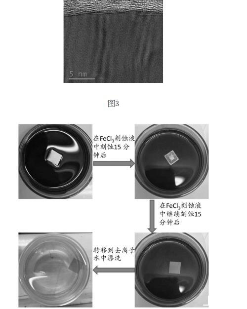 具體的,對(duì)于多層石墨烯/初始基底復(fù)合結(jié)構(gòu)以初始基底為銅舉例說(shuō)明,實(shí)物如圖2(a)、圖2(b)所示,其截面如圖所3示;蝕刻液選用FeCl3溶液。為便于本領(lǐng)域技術(shù)人員理解,以小尺寸多層石墨烯/初始基底復(fù)合結(jié)構(gòu)的蝕刻過(guò)程進(jìn)行展示,蝕刻過(guò)程如圖4所示,從圖4可看出,得到的多層石墨烯薄膜可自懸浮于液面上。