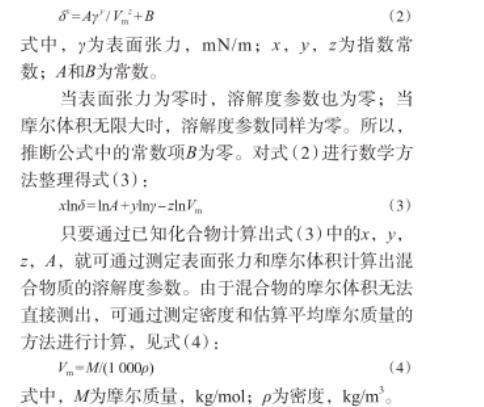 當(dāng)表面張力為零時(shí),溶解度參數(shù)也為零;當(dāng)摩爾體積無(wú)限大時(shí),溶解度參數(shù)同樣為零。所以,推斷公式中的常數(shù)項(xiàng)B為零。對(duì)式(2)進(jìn)行數(shù)學(xué)方法整理得式(3):