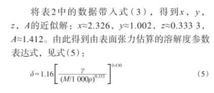 將表2中的數(shù)據(jù)帶入式(3),得到x,y,z,A的近似解:x≈2.326,y≈1.002,z≈0.333 3,A≈1.412。由此得到由表面張力估算的溶解度參數(shù)表達(dá)式,見式(5):
