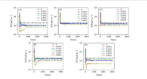 此外,活性分子稀疏地排列在界面上,如圖6(B)所示,并形成稀薄的混合吸附膜。因此,隨著時(shí)間的推移,吸附速率和脫附速率達(dá)到平衡,IFTs曲線(xiàn)也呈“L”形。在高濃度時(shí),瀝青質(zhì)組分獲得了較高的能量,能夠突破油水界面能壘,因此這些組分能夠更快地?cái)U(kuò)散到界面,并與P-S14-4分子無(wú)序地排列在界面上。當(dāng)這些亞組分與P-S14-4分子之間形成了最緊密的混合吸附膜時(shí),明顯的協(xié)同作用產(chǎn)生,導(dǎo)致IFT達(dá)到最小值。