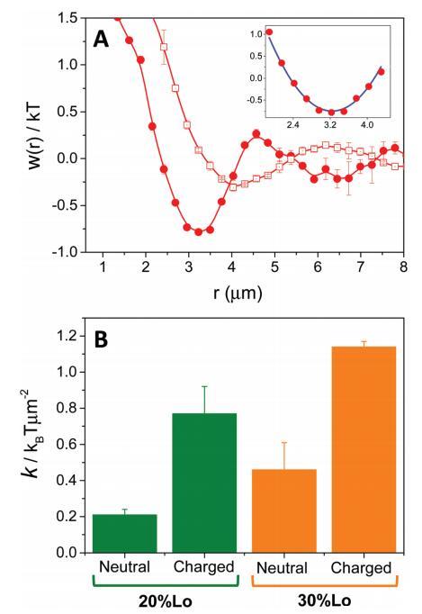 圖 4 (A) 域之間的平均力勢(shì) w(r) 從 由帶電(圓圈)或 中性(正方形)域。 插圖:擬合實(shí)驗(yàn)的例子 數(shù)據(jù)(藍(lán)色曲線)對(duì)應(yīng)于 20%Lo 的帶電域。 (B) 春天 諧波電位常數(shù),通過(guò)擬合 w(r) 的第一個(gè)谷值獲得 為中性和帶電雙層的二次函數(shù)(見(jiàn) A 中的插圖) 以指定的液體順序百分比。