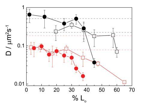 圖 2 擴(kuò)散系數(shù)(D)的實(shí)驗(yàn)值 小域 (1–3 mm) 作為面積百分比的函數(shù) 由液體有序相。 正方形代表中性系統(tǒng)和 環(huán)繞帶電系統(tǒng)。 黑色符號(hào)對(duì)應(yīng) 氣水界面處的單層和雙層的紅色符號(hào)。 虛線對(duì)應(yīng)于計(jì)算的 Dt 值的范圍 域大小的范圍,使用方程 (2) 或 (3)。 實(shí)線只是畫(huà)的 引導(dǎo)眼睛。