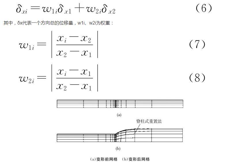 在數(shù)值模擬時,熔體自由表面在模擬的過程中會發(fā)生變形,自由表面的網(wǎng)格會因為自由表面位置的變化而發(fā)生變化。此時,需要采用網(wǎng)格重置技術(shù)。網(wǎng)格重置可以根據(jù)邊界點的位置的變化重新定位內(nèi)部網(wǎng)格節(jié)點。Spine法是一種比較簡單,適用于二維擠出成型的網(wǎng)格重置方法。其網(wǎng)格節(jié)點是沿著線性進行重新組織的,如圖3所示。節(jié)點的位置確定是按照一維方式進行邏輯排列的,這就像是對二維平面進行切片,切片的方式是沿著自由表面或者移動邊界的法向方向,從而得到最終的網(wǎng)格。Spine法是線性組織的,并且在每個線段的端點處都有相應(yīng)的節(jié)點。假設(shè)x1、x2是線段的2個端點。按照Spine法的規(guī)則,內(nèi)部節(jié)點的位移數(shù)學(xué)表達式為: