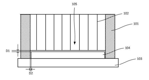 如圖1所示,在一個實施例中,所述筒壁101與所述隔離網(wǎng)壁102的高度差為晶圓104高度加上5微米~500微米之和。當所述筒壁101被真空吸附臺103固定時,所述隔離網(wǎng)壁102與所述晶圓104表面的非接觸氣隙的間距D1為5微米~500微米,本發(fā)明的非接觸氣隙被配置為當腐蝕液進入某一個腐蝕區(qū)域105時,基于液體表面張力使得腐蝕液不會進入到相鄰的腐蝕區(qū)域105,可以避免隔離網(wǎng)壁102對晶圓104造成損傷,大大提高工藝穩(wěn)定性,同時,可以消除因晶圓104表面不平整導(dǎo)致的直接接觸造成高度差異而產(chǎn)生有的部分直接接觸的情況。
