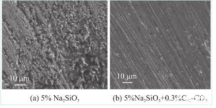 為研究兩親性碳點在硅酸鈉溶液中的摩擦學性能,利用SGW-10G型杠桿四球摩擦試驗機測試,測試方法參照行業(yè)標準SH/T 0189—92《潤滑油抗摩損性能測定法(四球機法)》,實驗參數(shù)設置如下,用掃描電鏡(SEM)拍攝摩擦表面形態(tài)圖片并分析如圖7所示。