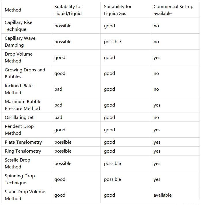 有些方法基于動力學(xué)原理,因此適合測量張力隨時(shí)間的變化。其他方法是靜態(tài)或準(zhǔn)靜態(tài)方法,也產(chǎn)生動態(tài)張力,但也允許接近液體界面的平衡狀態(tài),因此能夠測量平衡張力。動態(tài)方法需要考慮動態(tài)特性的數(shù)據(jù)解釋理論,而靜態(tài)方法的數(shù)據(jù)更容易理解。