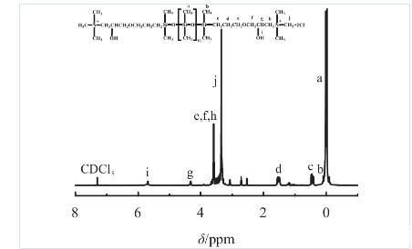 圖2中DAT的1H-NMR譜化學位移歸屬為:0.01(aH),0.1(bH),0.45(cH),1.53(dH),3.4(eH),3.6(fH),4.32(gH),3.55(hH),5.71(iH),3.35(jH),7.3(CDCl3溶劑峰)。