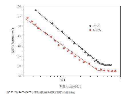 圖3 25℃時(shí)SAES和AES水溶液的表面張力隨其濃度的對(duì)數(shù)變化曲線
