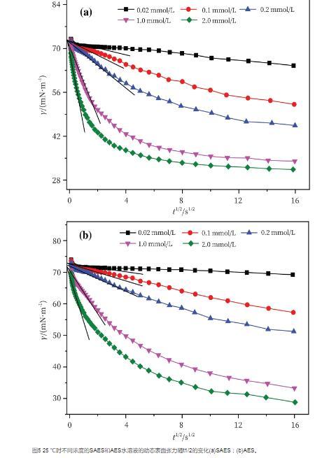 圖5 25℃時(shí)不同濃度的SAES和AES水溶液的動(dòng)態(tài)表面張力隨t1/2的變化(a)SAES;(b)AES。