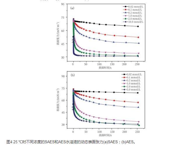 從圖4可以看出所測(cè)不同濃度不同表面活性劑的表面張力在初始階段均快速下降,一定時(shí)間后趨于平穩(wěn)狀態(tài)。這是因?yàn)閯?dòng)態(tài)表面張力測(cè)試過程中新形成的表面遠(yuǎn)偏離于平衡態(tài),吸附層離子的濃度很低,體相與吸附層的濃度差大,因此動(dòng)態(tài)表面張力變化很大。隨著吸附的進(jìn)行,次表面濃度和表面濃度逐漸增大,擴(kuò)散和吸附的速度均逐漸降低,動(dòng)態(tài)表面張力隨著吸附時(shí)間的增加而降低的趨勢(shì)也逐漸變得平緩。當(dāng)表面活性劑濃度增大時(shí),表面張力的下降幅度和速度也隨之增大,而且相應(yīng)地縮短了到達(dá)平衡狀態(tài)的時(shí)間。這種隨體系濃度的增加達(dá)到平衡所需的時(shí)間越短的趨勢(shì)與已經(jīng)報(bào)道的一些烷基表面活性劑的結(jié)果是相一致的。在相同濃度下,SAES表面張力下降的速率大于AES,這是由于SO4-在碳?xì)滏溨虚g的化合物比在端點(diǎn)者擴(kuò)散速度快。