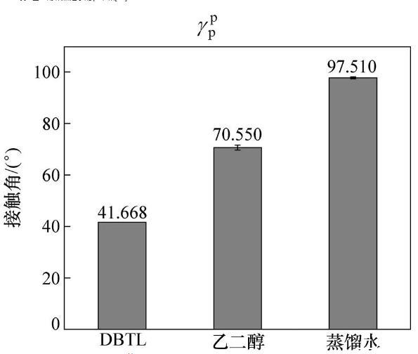 調(diào)和平均法計(jì)算CBT500與DBTL界面張力(12),CBT500、DBTL表面張力()、極性分量(p)、色散分量(d)研究是基礎(chǔ)。CBT500色散分量、極性分量通過引入2種測(cè)試液體求解二元二次方程組,DBTL色散分量、極性分量通過研究DBTL在PP薄板上靜態(tài)接觸角并結(jié)合表面張力是材料極性分量、色散分量之和進(jìn)行二元二次方程組求解。