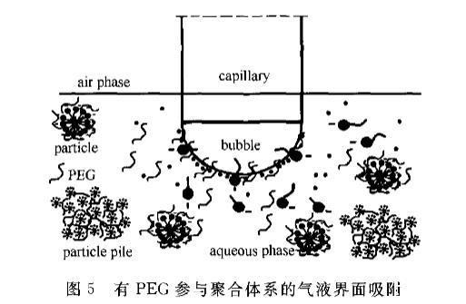 由圖3可見,有PEG參與的聚合體系。5rain的DST與圖2相比變化起伏較大,有先低后急升再緩降的變化模式,與一般的DST呈單調(diào)減小的趨勢(shì)有很大不同。這是因?yàn)樵诜磻?yīng)剛開始體系中除了單體、齊聚物和膠粒,又增加了PEG,而且PEG與齊聚物、膠粒作用形成粒子堆口]。PEG是完全水溶性物質(zhì),在體系水相中的濃度遠(yuǎn)遠(yuǎn)大于單體和齊聚物,但擴(kuò)散速率要小于單體及齊聚物,因此一開始部分新形成的氣液界面會(huì)由擴(kuò)散速率最快的單體迅速占領(lǐng),而隨時(shí)間推移PEG借助濃度優(yōu)勢(shì)會(huì)替代單體占據(jù)氣液界面,如圖5所示,最終達(dá)到平衡,由單體、齊聚物和PEG共同覆蓋整個(gè)氣液界面。PEG水溶液的氣液界面張力要比單體的氣液界面張力大得多,因此在水相中有大量單體存在的情況下,此聚合體系的DST會(huì)出現(xiàn)先低后急升的曲線形狀。這個(gè)狀況會(huì)一直持續(xù)到30rain時(shí),可以看出,PEG使體系直到30min時(shí)仍有大量游離單體存在于水相,而無PEG參與的體系此時(shí)已無單體游離在水相中。這一點(diǎn)可以從圖6轉(zhuǎn)化率一時(shí)間曲線得到證實(shí),無PEG參與的體系30min時(shí)已接近聚合終點(diǎn),而有PEG參與的體系轉(zhuǎn)化率才只有25左右。待反應(yīng)至50min時(shí),DST趨勢(shì)平穩(wěn),水相中游離的單體已經(jīng)很少,此時(shí)轉(zhuǎn)化率在49左右,說明單體已基本進(jìn)入到膠粒中。這個(gè)狀態(tài)一直維持到60min時(shí)。75min時(shí)的體系有很大變化,從宏觀看粒徑發(fā)生轉(zhuǎn)變,由大變小。從DST曲線看氣液界面張力明顯提高,轉(zhuǎn)化率已快速增加到95,接近終點(diǎn)。此時(shí)體系中對(duì)DST的貢獻(xiàn)主要以脫離粒子堆的成熟粒子l3和PEG為主。