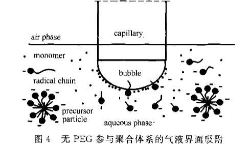 由圖2可見,無PEG參與的聚合體系中,隨聚合進(jìn)行,體系所表現(xiàn)的氣液界面張力趨勢(shì)為逐漸增大,從5min的28mN·m~左右到6Omin的60~65ITIN·m~,75min則稍有回落,在55~61mN·m。各時(shí)間段的DST趨勢(shì)較為平穩(wěn)。這種氣液界面張力隨聚合進(jìn)行逐漸上升的趨勢(shì)較為符合無皂乳液聚合反應(yīng)機(jī)理。在反應(yīng)初期水相中不僅有溶解在水中的單體,還有引發(fā)形成的齊聚物,這種齊聚物一端帶有疏水鏈段,另一端帶有親水性的一SO引發(fā)劑碎片,具有表面活性。當(dāng)齊聚物達(dá)到膠束濃度時(shí)會(huì)聚并成基本粒子,由幾十個(gè)到上百個(gè)齊聚物組成。溶解在水相中的單體分子量相對(duì)齊聚物小很多,體積小,擴(kuò)散速率快,極易遷移至氣液界面。對(duì)于一開始的反應(yīng),體系中仍有大量單體存在,水相中的單體濃度基本保持在飽和狀態(tài),因此大部分氣液界面首先由單體等物質(zhì)占據(jù),還有極少部分的界面由具有表面活性的齊聚物覆蓋,如圖4所示。所以與圖1對(duì)比會(huì)發(fā)現(xiàn),5min時(shí)的氣液界面張力非常接近單體本身的氣液界面張力。隨聚合進(jìn)行,水相中的單體逐漸耗光,氣液界面張力開始逐漸上升,此時(shí)到達(dá)氣液界面的則主要是齊聚物和膠粒,相對(duì)單體的遷移速率要慢很多,因此10min以后的DST衰減斜率要大于5rain時(shí)的。